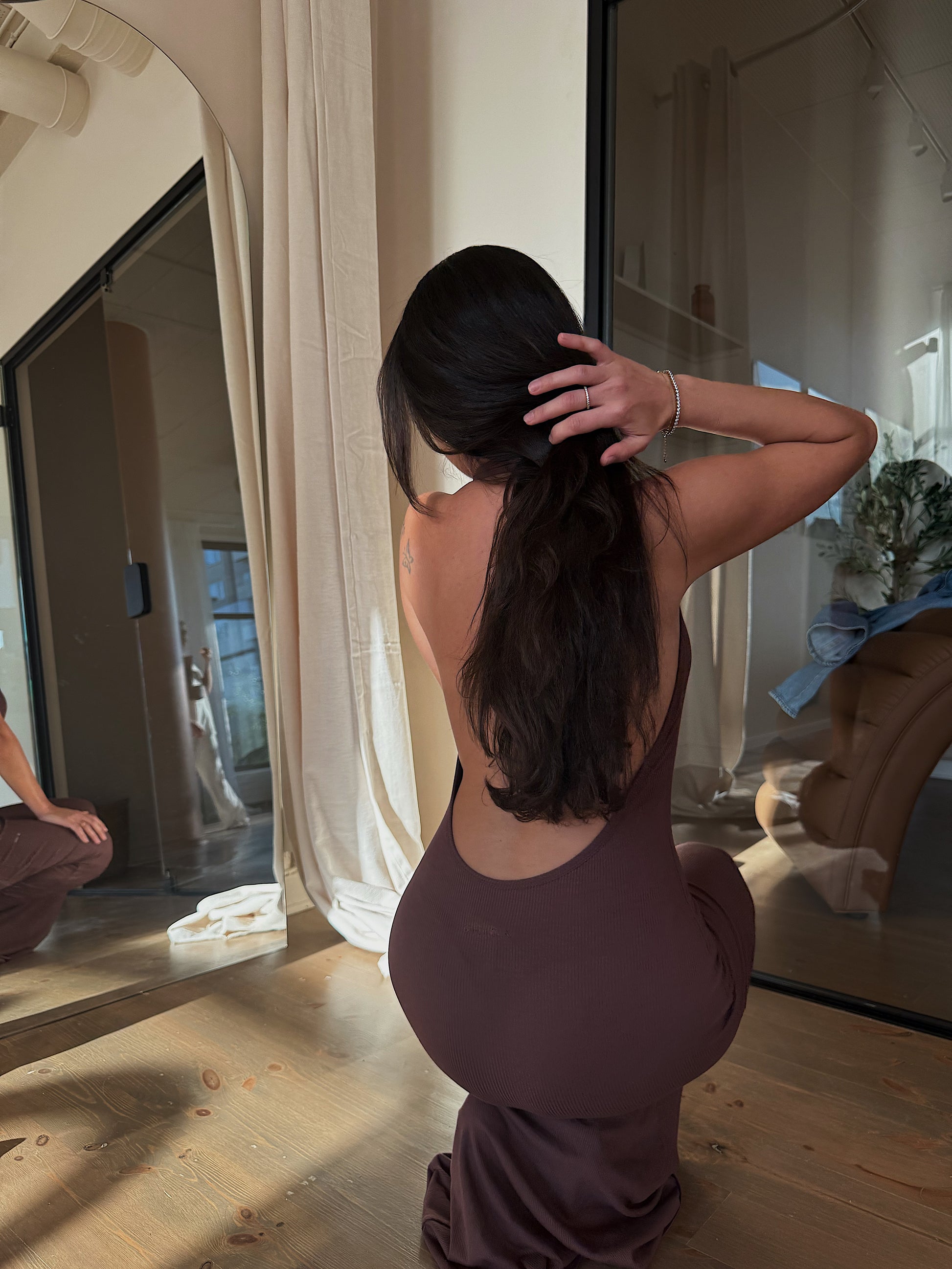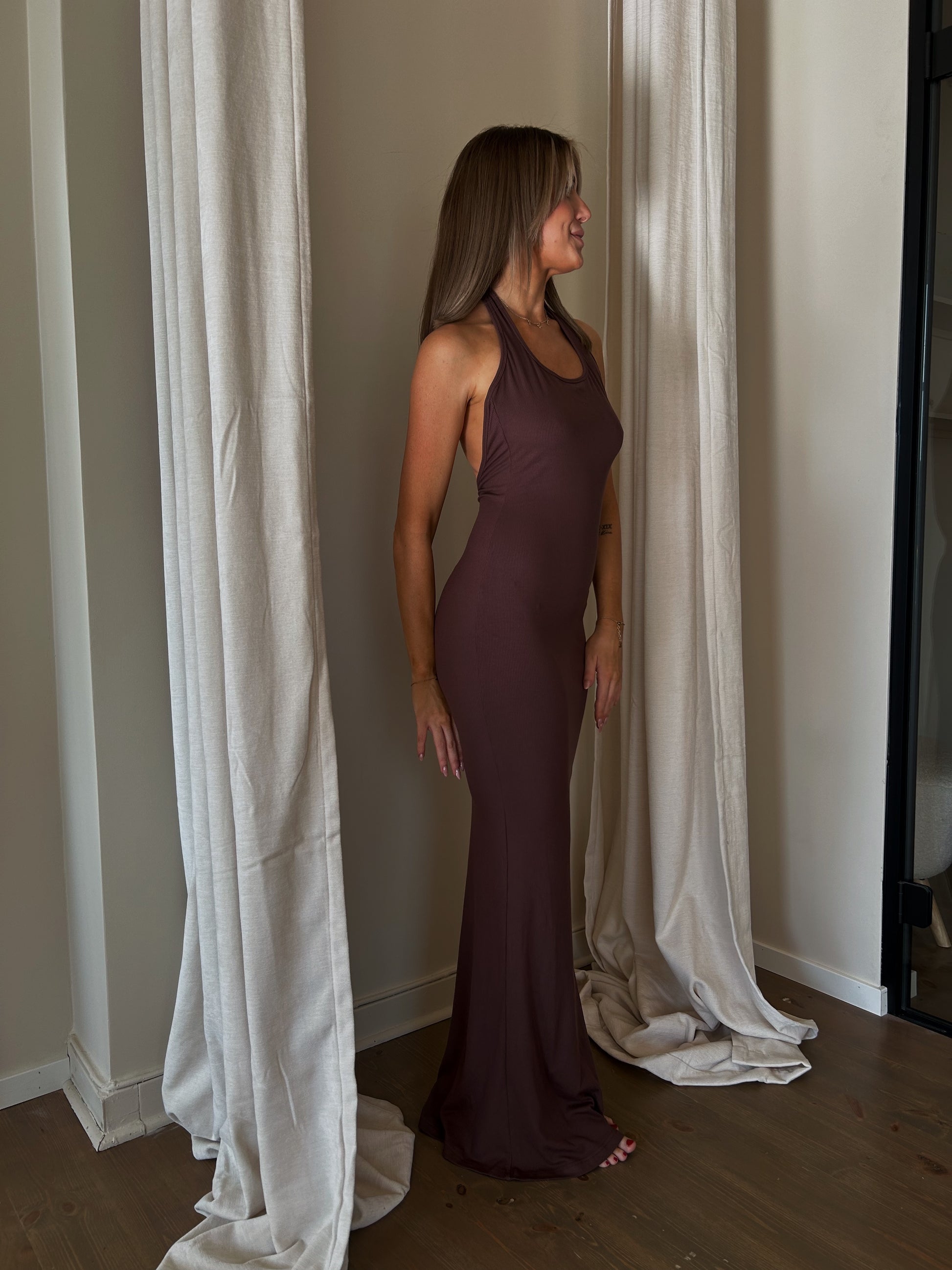 Vår signatur färg brun i en lyxig bekväm klänning, med låg skurning och mjukt material, klänningen är lång och lämnar en slim känsla.