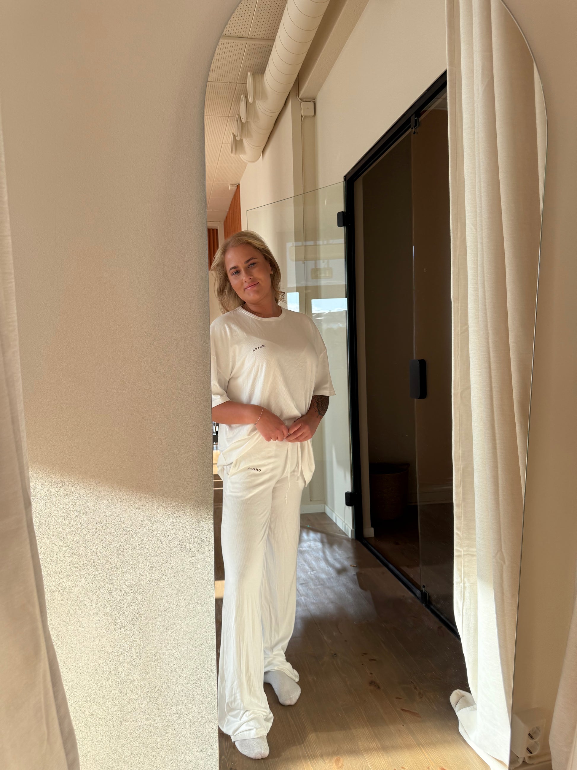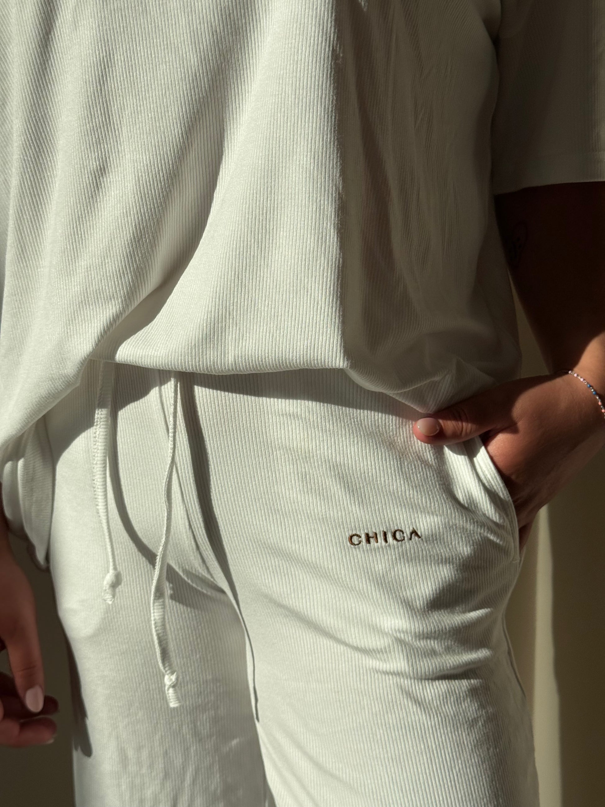Matching our just Vibing! Vårt oversize set är perfekta mys outfiten. Enkel simpelhet med en krämvit bas och våran. Bruna logga in broderad.
